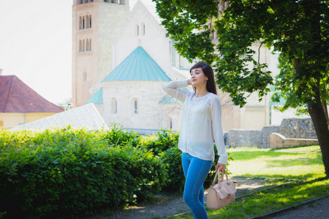 My outfit looks really simple from distance, but it has a lot of beautiful details, if you look at it closer. I love the plain jeans-white blouse combination which I paired with a blush pink bag and shoes - genuine Spring mood.